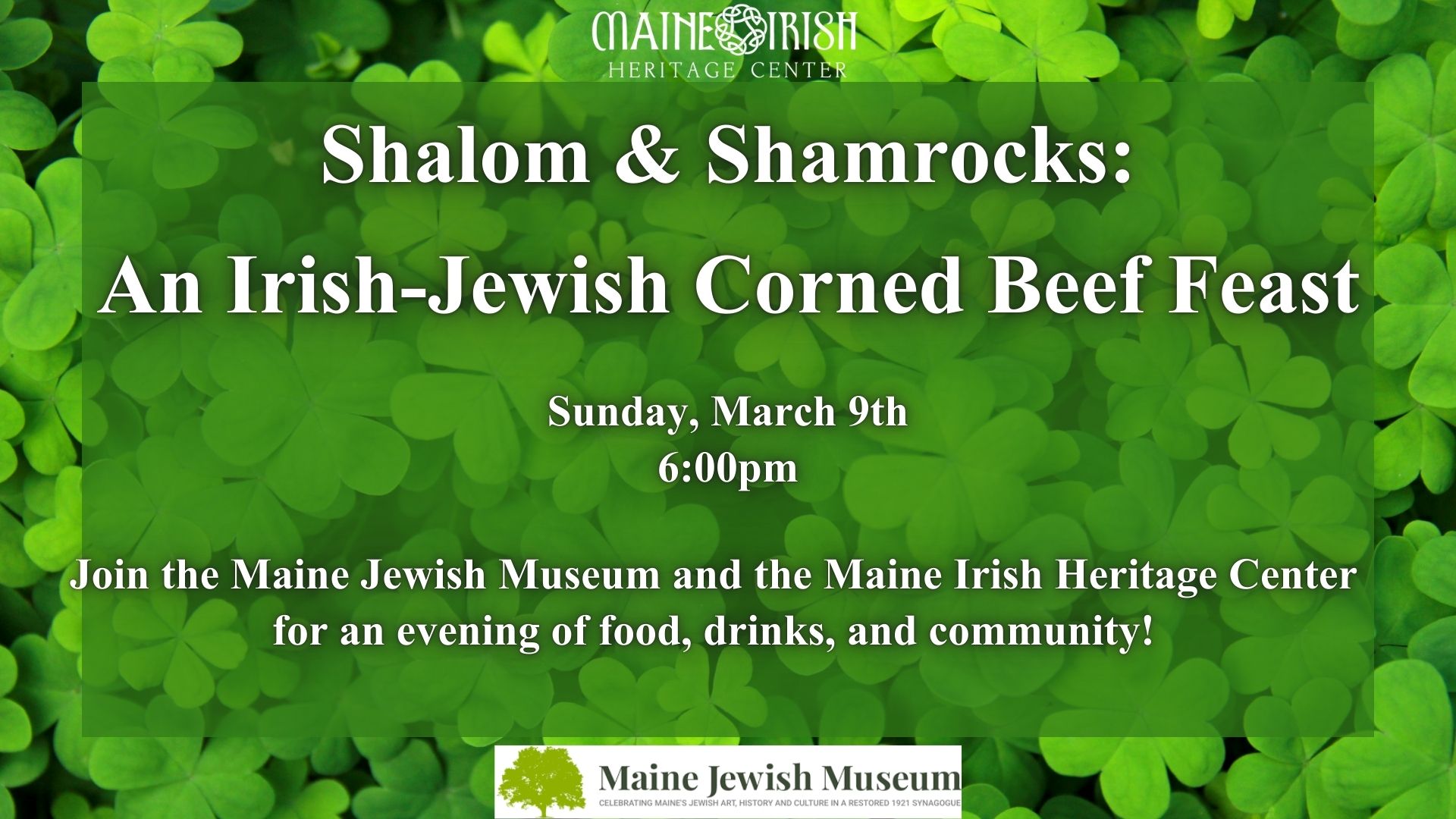 Did you know that the Irish corned beef dinner has a Jewish origin? Corned beef became a St. Patrick’s Day staple because in the early 20th century, when Irish and Jewish immigrants lived in close proximity in many U.S. cities, Irish immigrants noticed the corned beef their Jewish neighbors enjoyed was similar to bacon… but cheaper and more accessible. In fact, kosher butchers had almost as many Irish customers as Jewish customers back in the day! In this spirit, join us for a fun and delicious event, featuring corned beef, cabbage, and colcannon as well as a Jewish deli buffet, that brings the luck of the Irish to the Maine Jewish Museum and celebrates our shared immigrant roots. Red ale and Dr. Brown’s mocktails? But of course! Bonus: Guinness Stout cake and black-and-white cookies for a sweet ending!